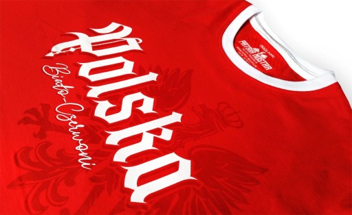 Czerwony kolor materiału w połączeniu z dużym napisem: Polska, wykonanym elegancką i oryginalną, gotycką czcionką, stanowi doskonałą propozycję dla każdego patrioty, który kocha Polskę i chce wyraźnie zaakcentować swoje przywiązanie do naszej Ojczyzny. Napis wykonany jest na tle wtopionego w kolor koszulki orła, symbolizującego m.in. odwagę i siłę. Koszulka świetnie sprawdzi się również dla najwierniejszych, słynących na całym świecie kibiców polskich sportowców, którzy reprezentują z wielkimi sukcesami nasz kraj w takich dyscyplinach jak: piłka nożna, siatkówka, piłka ręczna, żużel, kolarstwo, zapasy, boks, MMA, tenis, skoki narciarskie i wiele innych.