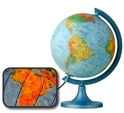 Jest to globus zawierający mapę polityczną Świata, natomiast po podświetleniu pojawia się mapa fizyczna. Więc na jednym globusie mamy 2 mapy. Świetnie nadaje się do przyswajania geograficznego położenia nie tylko państw, ale także możemy znaleźć szczyty gór, niziny, wyżyny itp.