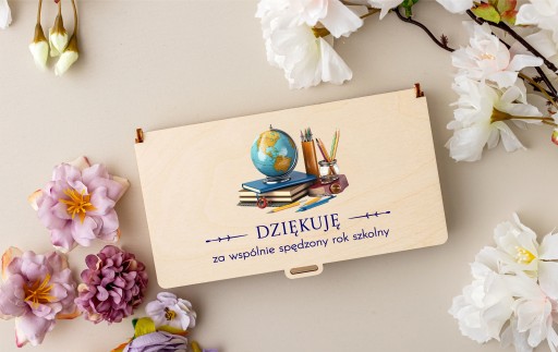 Piękny nadruk na drewnianym pudełku dodaje mu uroku i wyjątkowości, czyni go doskonałym prezentem dla każdego nauczyciela, który może się poczuć wyjątkowo w tym szczególnym dniu.