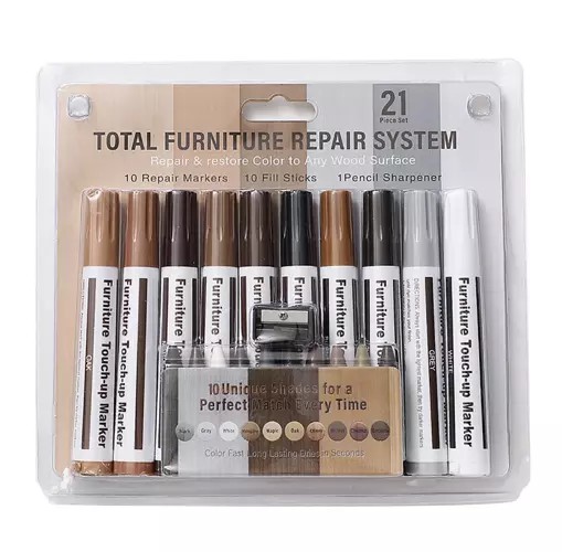 - NAPRAWA ZARYSOWAŃ NIGDY NIE BYŁA TAK PROSTA - drobne uszkodzenia, rysy powierzchni teraz łatwo naprawisz przy pomocą naszego zestawu do naprawy mebli. Naprawa następuje poprzez wypełnienie głębszego ubytku woskiem, oraz dorysowanie struktury drewna odpowiednim kolorem markera.