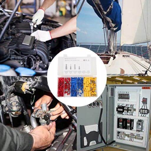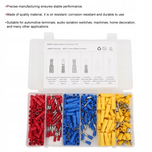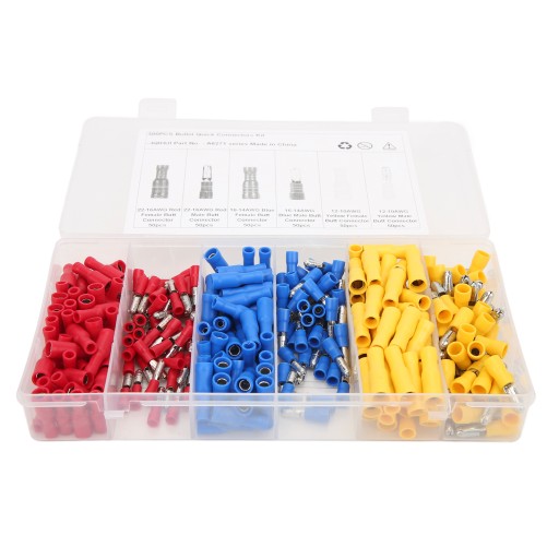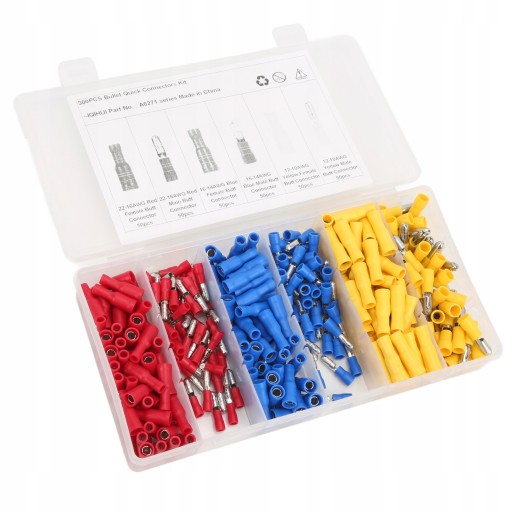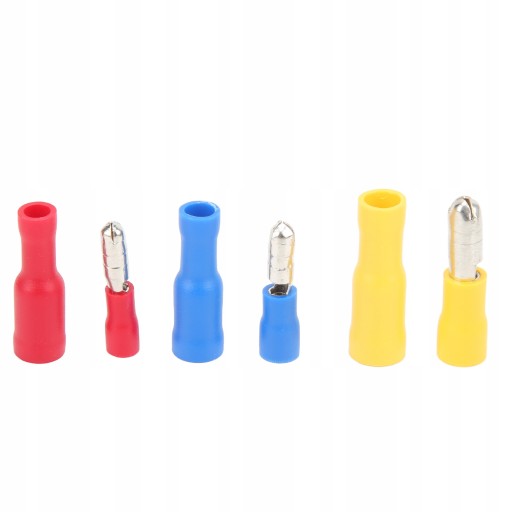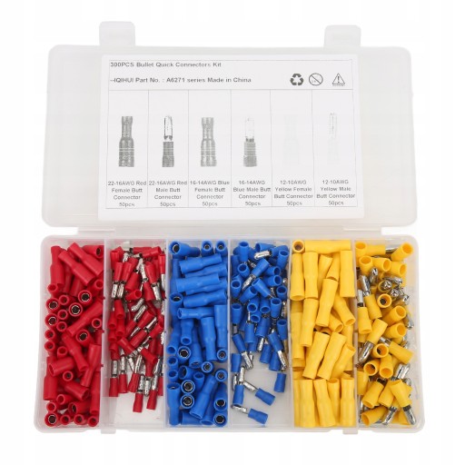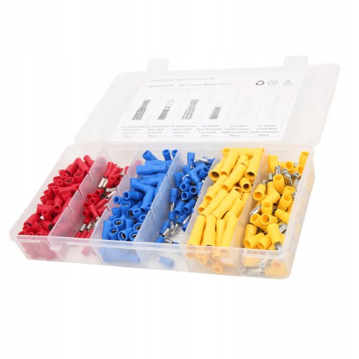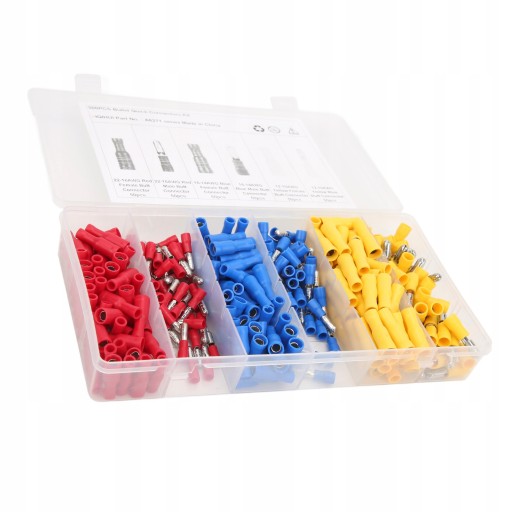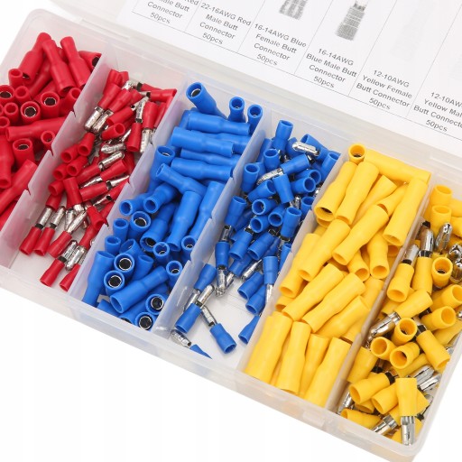 5. Zawiera 50 szt. 22-16AWG czerwone złącze męskie, 50 szt. 22-16AWG czerwone złącze żeńskie, 50 szt. 16-14AWG niebieskie złącze męskie, 50 szt. 16-14AWG niebieskie złącze żeńskie, 50 szt. 12-10AWG żółte złącze męskie, 50 szt. 12-10AWG żółte złącze żeńskie .