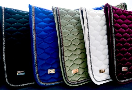Pady Velvet Glam pikowane w heksagony, wykończone błyszczącą taśmą, ozdobnymi sznurami oraz małym złotym logo HORSS w dolnym rogu.