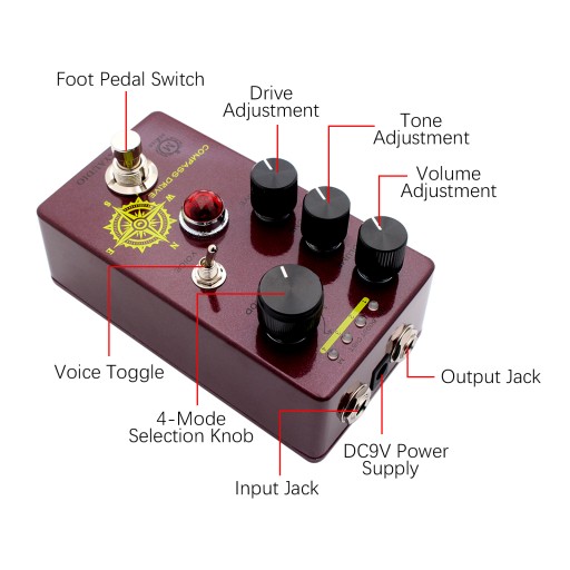 Z pokrętłami regulacji głośności, tonu i napędu, aby dostosować parametr efektu overdrive.