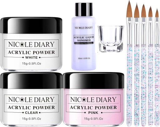 ZESTAW DO PAZNOKCI AKRYLOWYCH 3x PROSZEK PŁYN FORMY PĘDZLE NICOLE DIARY