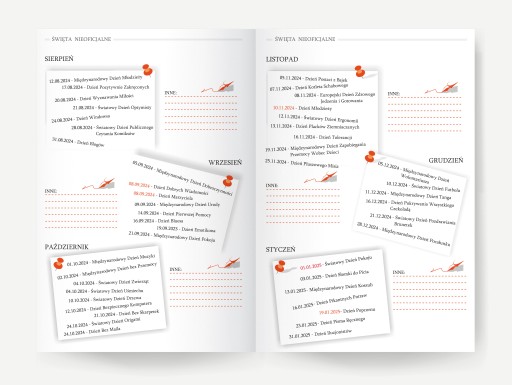 - kolor czcionki wewnątrz kalendarza szkolnego w estetycznym połączeniu czerni z czerwienią