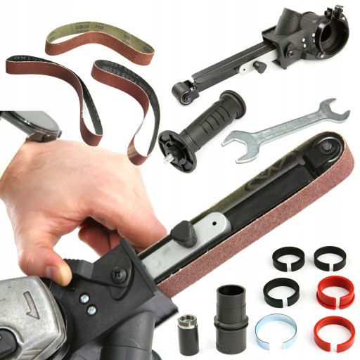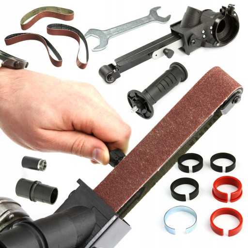 Przystawka posiada blokadę , dzięki której można wymienić pasek ścierny w mniej niż minute a także pokrętło służące do regulacji paska tak aby nie spadał on podczas pracy