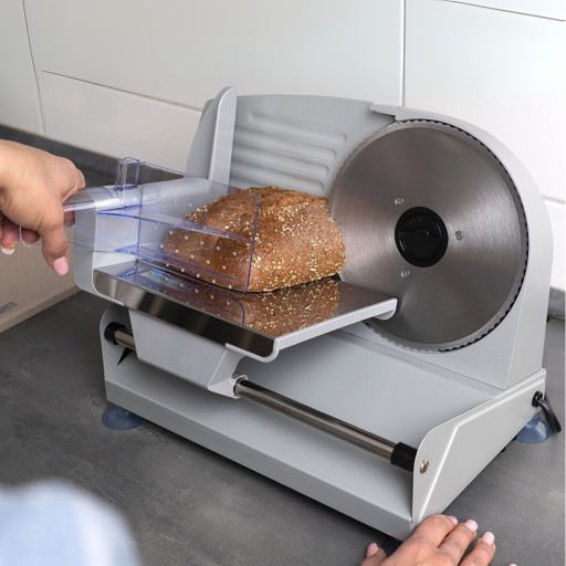 Domowa krajalnica to bardzo praktyczne urządzenie. Dzięki niemu możesz dokładnie kontrolować co jesz, kupując produkty w jednym kawałku. Tak przechowywane artykuły spożywcze dłużej są świeże i smaczne. Nie pozbawi cię to przyjemności płynącej ze smakowania cieniutkich plasterków szynki wędlin długo dojrzewających, salami czy wytrawnego sera. Krajalnica pokroi także pieczywo, duże warzywa i owoce na plastry. Samodzielnie wyregulujesz grubość plastrów, na jakie masz ochotę w granicach od 1 do 15 mm.
