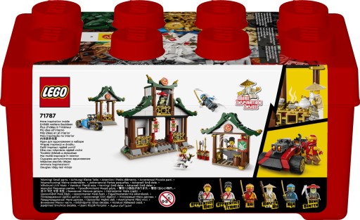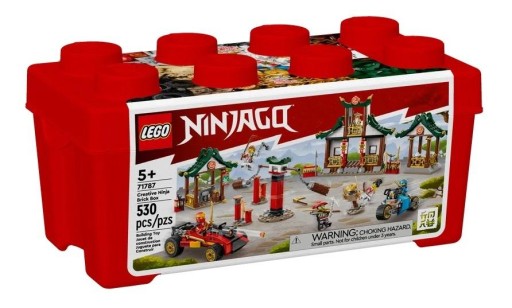 Zestaw LEGO NINJAGO Kreatywne pudełko z klockami ninja (71787) zawiera wszystko, czego potrzebują fani ninja w wieku od pięciu lat, aby szkolić swoich bohaterów i cieszyć się wieloma godzinami akcji. Zestaw zawiera trzy budynki, tor przeszkód z trzema interaktywnymi stanowiskami, zbrojownię pełną broni, samochód ninja i motocykl ninja.