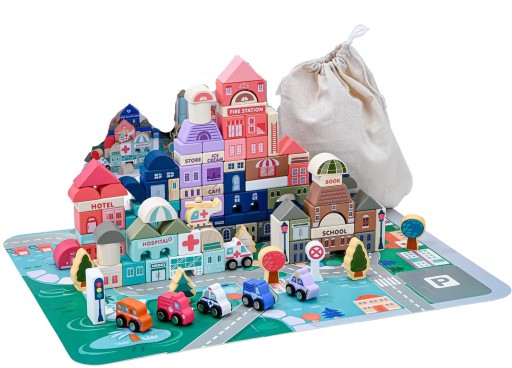 Zestaw edukacyjny wykonany z, naturalnego drewna jest doskonałą zabawką ogólnorozwojową, która zachęca do wspólnej zabawy. 115 Klocków to wielobarwny zestaw licznych figur o różnych wymiarach, które dają nieograniczone możliwości tworzenia własnych konstrukcji. Wszystkie materiały wykorzystane do stworzenia zabawki posiadają atesty, a także zostały pomalowane nietoksycznymi farbami.