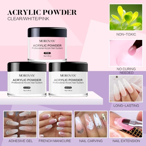 3 kolory pudru akrylowego do paznokci, przezroczysty, biały i różowy. Zestaw akrylowych pudrów do paznokci MOROVAN, stworzony na bazie nieżółknącej formuły, bezpęcherzykowych polimerów. Akrylowy puder do paznokci stworzył warstwę ochronną i wyjątkową wytrzymałość, zapewniając naturalny wygląd paznokci.