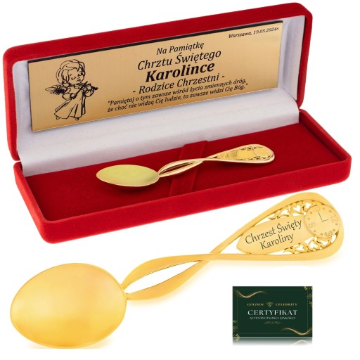 - Elegancka srebrna łyżeczka z grawerem to doskonały prezent na chrzest lub roczek. Zapakowana w eleganckie pudełko, dołączony certyfikat autentyczności. Idealna pamiątka na całe życie.