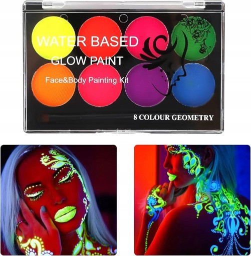 Zestaw zawiera 8 jaskrawych kolorów, które świecą w nocy oraz umożliwiają dzieciom tworzenie różnorodnych wzorów i malunków na twarzy i ciele, od prostych motywów po skomplikowane kreacje artystyczne.