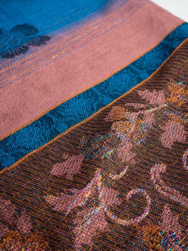 Kaszmirowy szal w kolorze brudnego różu. OzdobionyTurkusowymi i miedzianymi wstawkami.