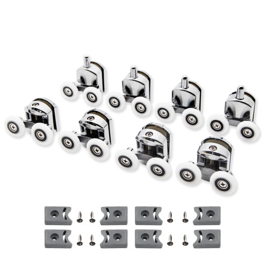 W zestawie znajduje się komplet rolek górnych (podwójnych) i dolnych (pojedynczych) do kabiny prysznicowej wraz z zaślepkami. Górna rolka posiada regulowany element wpinający, który umożliwia bardzo dobre dopasowanie do kabiny.