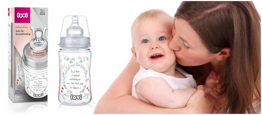 Butelka do podawania odciągniętego mleka mamy. Zdobiona dookoła w efektowne wzory zgodne z najnowszymi trendami, dostępna w dwóch modnych kolekcjach.
