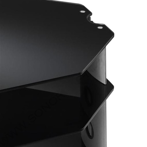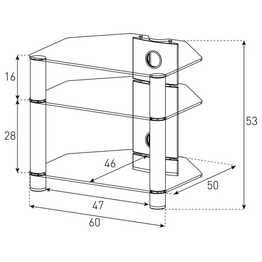 Blat stolika o szerokości 60cm wraz z dwoma szklanymi półkami zapewnia idealne miejsce do przechowywania sprzętów Hi-Fi, takich jak odtwarzacz CD/DVD/Blu-Ray, amplituner, streamer, przedwzmacniacz czy gramofon.
