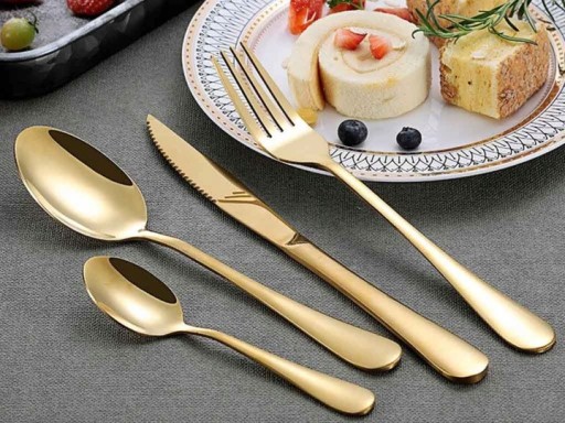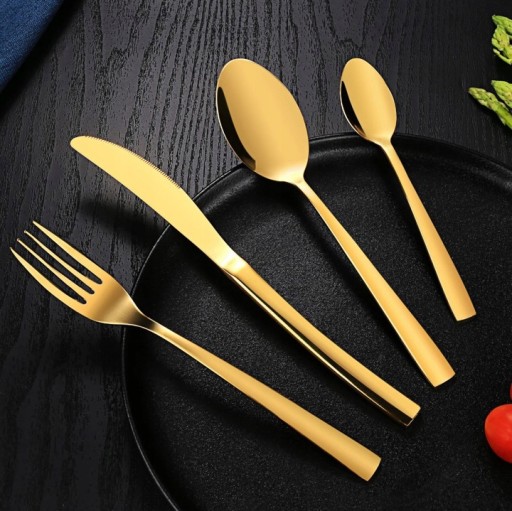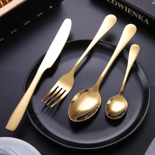 - 24-częściowy złoty zestaw sztućców składa się z 6 noży, 6 łyżek stołowych, 6 obiadowych i 6 łyżeczek, dzięki czemu jest dobrym wyborem dla każdej rodziny.