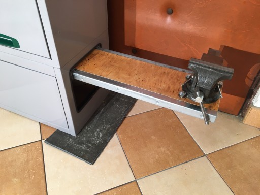 Szafka nr 2 (po prawej) posiada 6 szuflad (4 z przegrodami, 1 pojemnik na drobnice), górną półkę, 5 pojemników magazynowych, wysuwany stół z imadłem oraz zamykaną dolną przestrzeń na nadkole.
