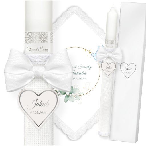 -ręcznie dekorowaną świecę z imieniem i datą wypisaną na serduszku oraz napisem "Chrzest Święty", który został wykonany w metodzie Hot Stampingu (pięknie mieniący się srebrny nadruk)