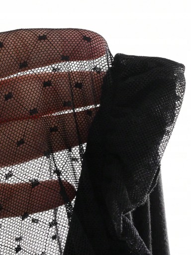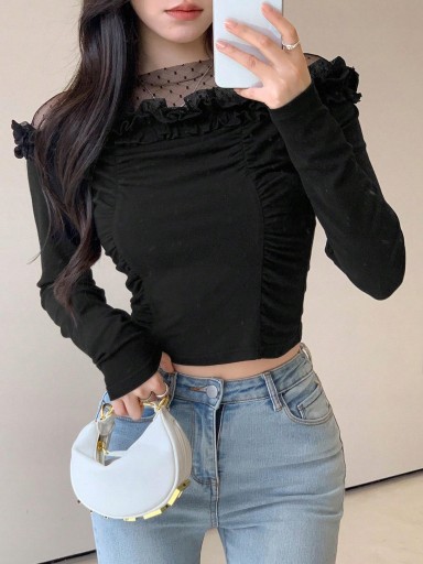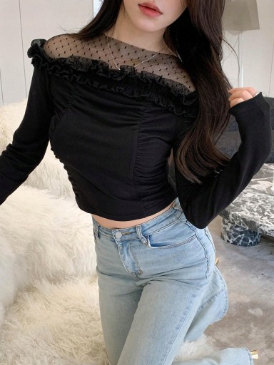 DŁUGI RĘKAW FALBANKI DAZY M CZARNA BLUZKA DOPASOWANA GROSZKI SIATECZKA