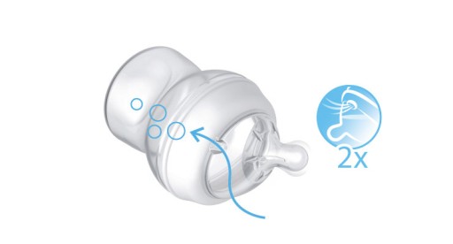 Smoczek jest zawsze wypełniony mlekiem i posiada podwójny system antykolkowy, dzięki czemu zapobiega połykaniu powietrza.