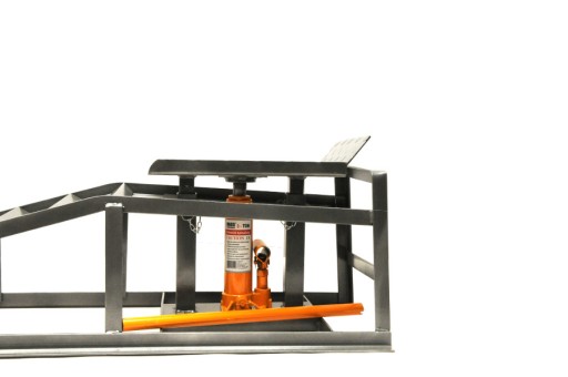 Solidne metalowe najazdy samochodowe z podnośnikami i zabezpieczeniami.