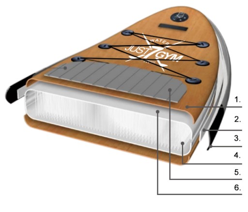 Deska Sup Just7Gym Paddle Board została wykonana z dwuwarstwowego materiału DWF, który został wzmocniony wewnątrz tysiącami włókien Dropstitch. Dzięki temu zwiększona została odporność na wahania temperatur oraz na uszkodzenia – gdy wpłyniesz nieoczekiwanie na przeszkodę nie musisz mieć obaw, że ulegnie pęknięciu.