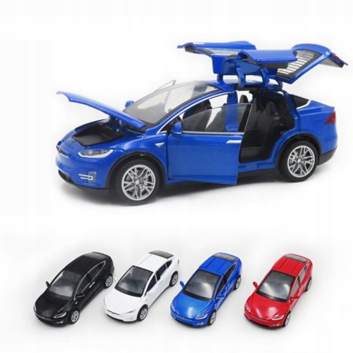 Model samochodu TESLA X w skali 1:32 z akumulatorem. Wszystkie drzwi, maska i bagażnik są otwarte. Reflektory włączone, imitacja dźwięku silnika, alarm.