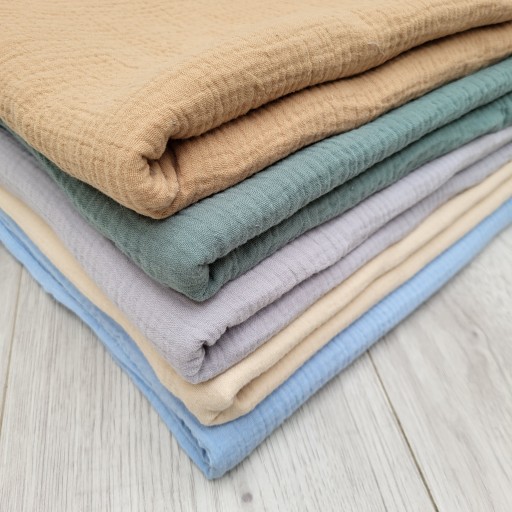 Otulacz wykonany z tkaniny premium Muślin double gaze 100% bawełny z charakterystyczną kreszowaną fakturą.