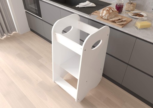 Nasz kitchen helper został wyprodukowany w Polsce. Jest lekki i stabilny. Zabezpieczony podest posiada regulację na dwóch wysokościach: 22 cm, 30 cm licząc od podłogi, dzięki której będzie dłużej służył Twojemu dziecku. Produkt wyprodukowany z wysokiej jakości materiału jakim jest płyta meblowa.