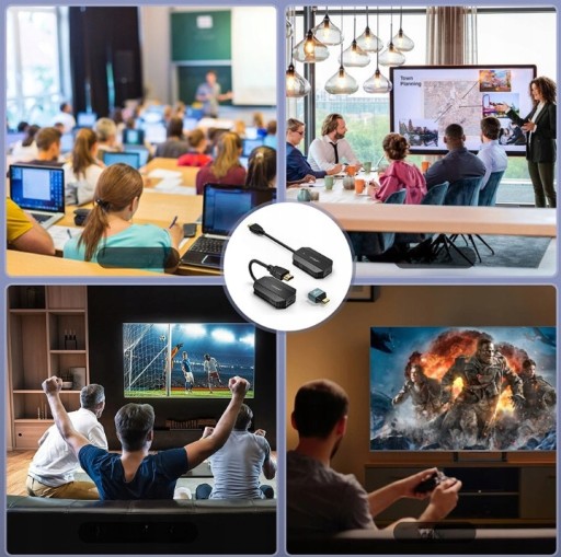 Dzięki nadajnikowi i odbiornikowi WD9905 możesz łatwo przesyłać obraz i dźwięk 1080P ze źródła (takiego jak komputer, laptop, smartfon, Play Station 5, Xbox) na duży ekran lub projektor.