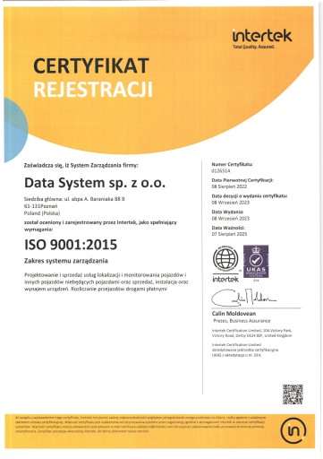 Firma Data System działa na rynku od 18 lat, monitoruje ponad 70 tyś pojazdów, posiada międzynarodowy certyfikat ISO 9001:2015, co roku weryfikowany przez międzynarodowych audytorów.