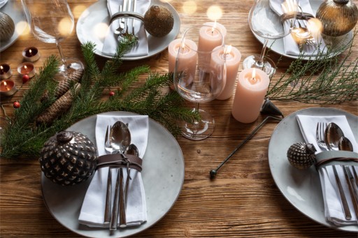 Stół świąteczny: Ułóż sztuczną gałązkę świerkową wzdłuż środka stołu jako ozdobę świąteczną. Możesz dodać na nią świeczki, ozdoby świąteczne i owoce.