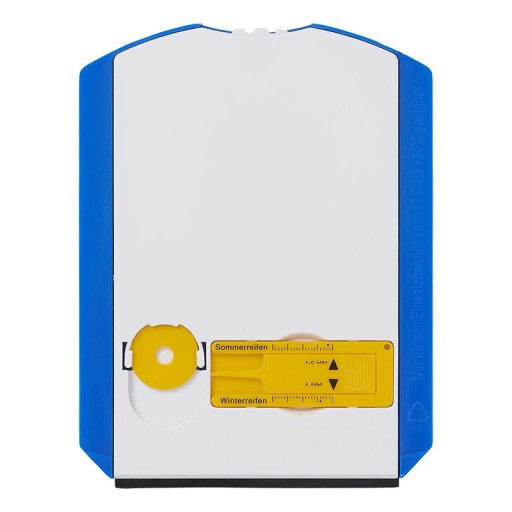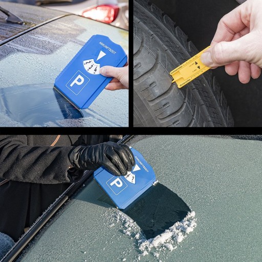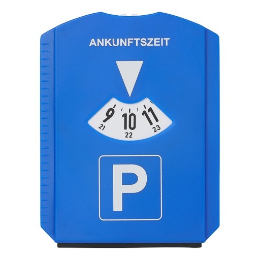 - Tekst w języku niemieckim Godzina przybycia: Ankunftszeit - Tarcza parkingowa ze skrobaczką do lodu, miernikiem głębokości bieżnika opon, ściągaczem do szyb i monetą do wózka sklepowego