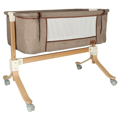 CECHY PRODUKTU Łóżeczko dostawka dla niemowląt dzieci drewniana na kółkach kojec brązowy