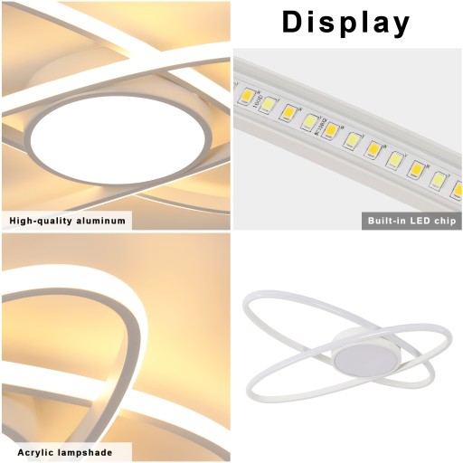 Lampa sufitowa jest montowana na prostokątnej podstawie do sufitu i składa się z trzech nakładających się i równoległych przesuniętych wydłużonych owali, zapewniając dużą powierzchnię oświetleniową.