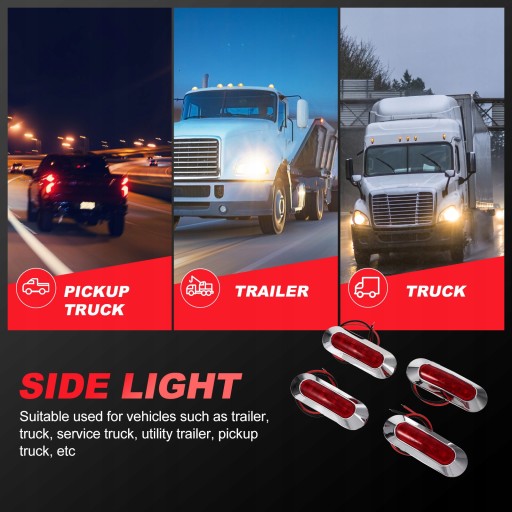 Opis Jest to zestaw 2-częściowych bocznych świateł obrysowych LED, które można zwiększyć widoczność i bezpieczeństwo na drodze. Nadaje się do pojazdów takich jak przyczepa, ciężarówka, ciężarówka serwisowa, przyczepa użytkowa, furgonetka itp. diody LED stanowią świetne zamienniki żarówek.