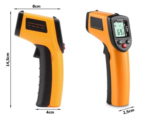 Termometr na podczerwień, pozwala na precyzyjne zmierzenie temperatury w zakresie -50 do +380 stopni celsjusza. Miernik pozwala na zmierzenie trudno dostępnych miejsc o wysokiej temperaturze.