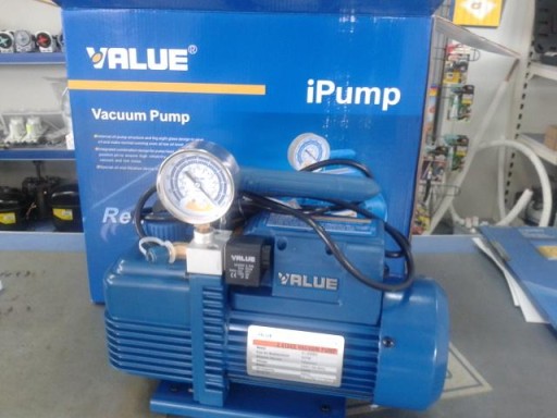 Pompa próżniowa do klimatyzacji i autoklimatyzacji VALUE V-i220SV z elektrozaworem i wakuometrem. Pompy próżniowe VALUE to pompy łopatkowe, jednostopniowe ze smarowaniem olejowym z wbudowanym wakuometrem, stosowane miedzy innymi: w klimatyzacji, służące do usuwania gazów (wytworzenia podciśnienia) w zamkniętej przestrzeni. Ponadto pompa ta jest wyposażona w: