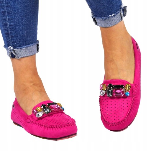RÓŻOWE ZAMSZOWE WYGODNE LEKKIE DAMSKIE MOKASYNY Z KAMIENIAMI FUKSJA GOODIN
