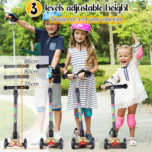 Kierownica hulajnogi może być regulowana na 3 różnych wysokościach 75 cm, 80 cm i 86 cm, odpowiednia dla dzieci w wieku od 3 do 13 lat.