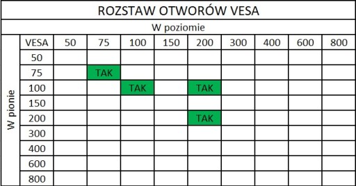 Zastosowany najbardziej popularny standard VESA sprawia, że możemy zainstalować praktycznie każdy telewizor wyposażony w otwory o rozstawie 5x75, 100x100, 200x100, 200x200,i wadze nie przekraczającej 20kg.