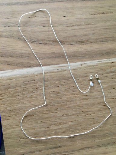 Linka do strojenia; kondensator; radiomagnetofon. Linka z włókien plecionych o długości 50 cm, z pętlami na obu końcach. Produkt Zakłady Lubartów. Część nieużywana, cena za 1 szt.