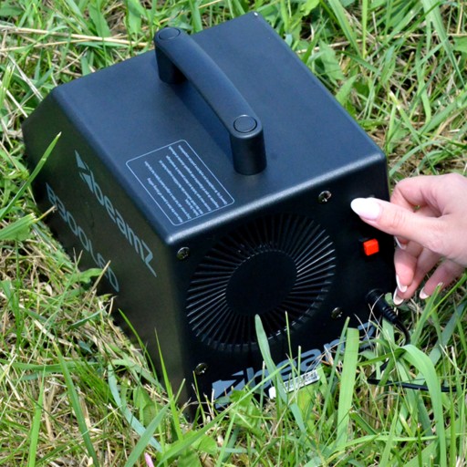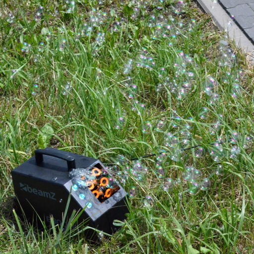 Silny wentylator, który wydmuchuje bańki w przód, tworząc spektakularny efekt wirujących baniek.