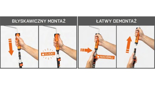 Innowacyjny kij malarski z systemem click, nowość 2024! Lekka i zespolona konstrukcja, solidnie wykonany, do malowania wałkami malarskimi i wałkami do gładzi. Wykonany z aluminium i mocnego tworzywa, rękojeść pokryta pianką EVA co zapobiega brudzeniu rąk. Dwuskładowy kij z szybkim systemem wymiany wałka.