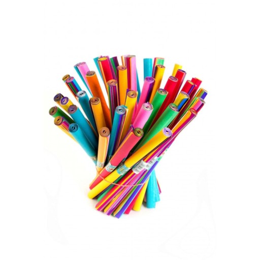 - Gładka bibuła TYMOS w dziesięciu intensywnych kolorach, tj. żółtym, białym, zielonym - jasnym i ciemnym, błękitnym, niebieskim, pomarańczowym, fioletowym, czerwonym oraz różowym.
