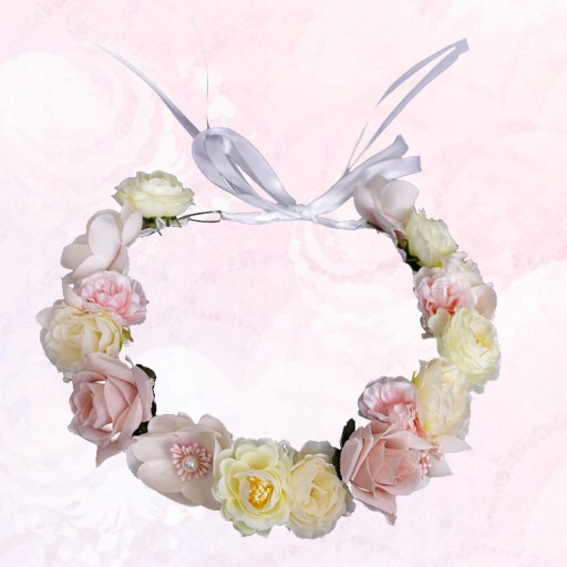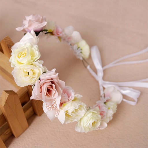 Ten przedmiot to opaska kwiatowa złożona z różowych i żółtych kwiatów. Wiązana jest na dwie tasiemki w kształcie kokardki, kolor jest świeży i naturalny, wstążka powiewa na wietrze, jest bardzo odpowiednia dla pań na wakacjach nad morzem, sprawdzi się również podczas codziennych podróży.