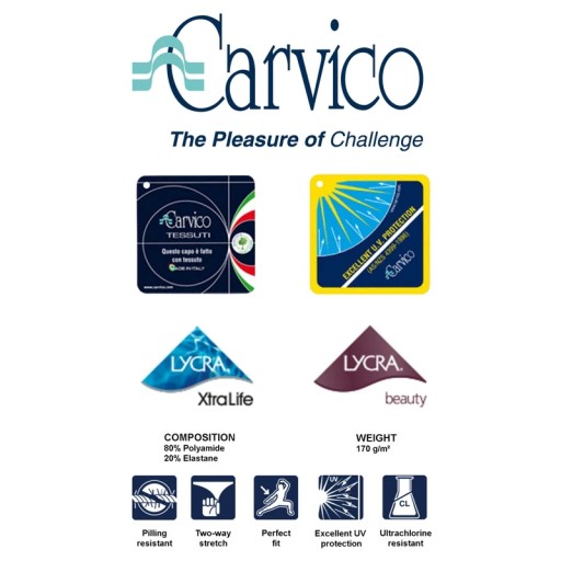 Uszyty z doskonałej jakości włoskiej dzianiny Carvico, która charakteryzuje się: