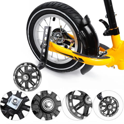 - Regulacja wysokości: Kółka można regulować w zakresie wysokości, aby dopasować je do rozmiaru roweru i dziecka. Pasują do kół od 12” do 20”.