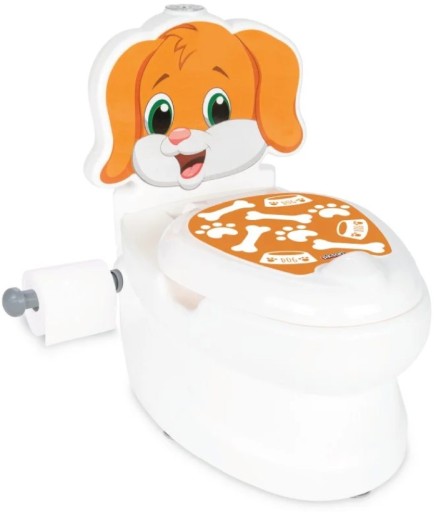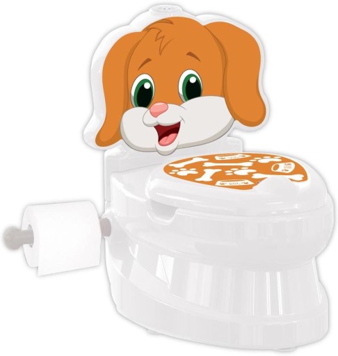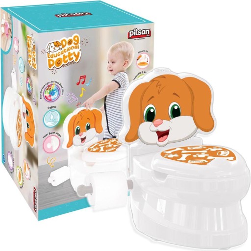 Nocniczek dla dzieci, który jest interaktywny i pochodzi z marki Pilsan. Toaleta ma uroczy print brązowego pieska oraz wysuwany uchwyt na papier toaletowy.